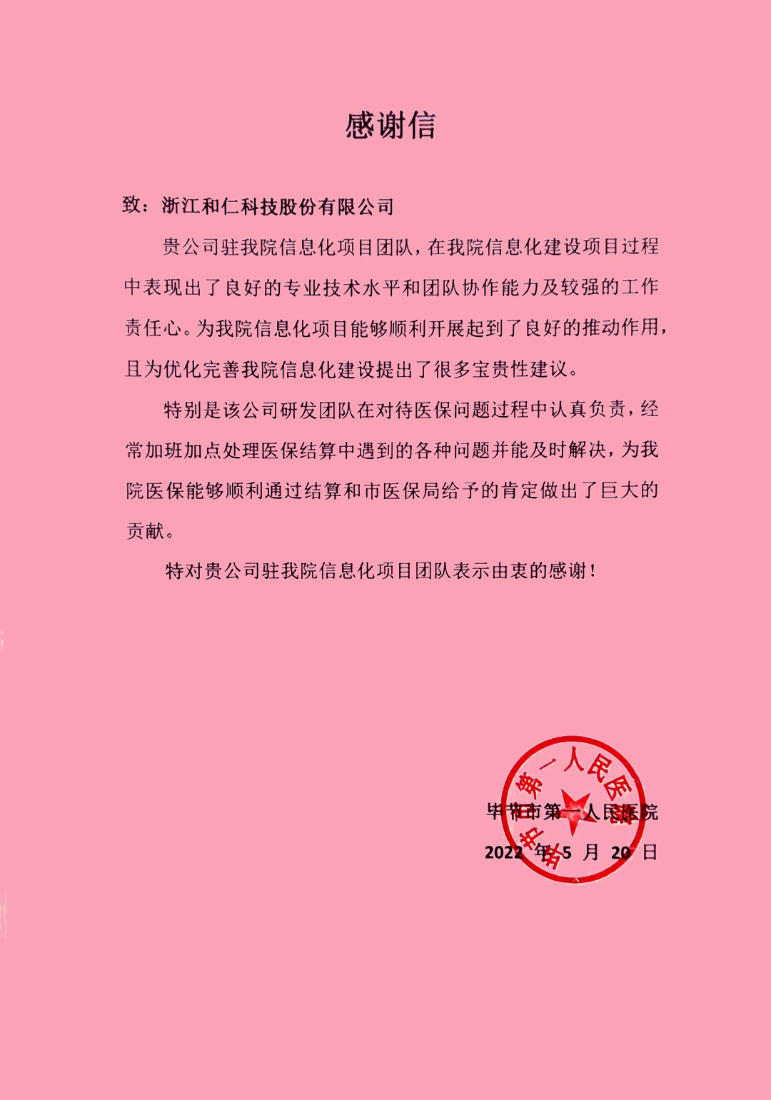 在這春意盎然、感恩勞動的五月,浙江和仁科技股份有限公司(以下簡稱“和仁科技”)收到了一封來自畢節(jié)市第一人民醫(yī)院的感謝信,字里行間充滿了對駐場團隊良好專業(yè)技術和團隊協作能力的認可與贊揚,特別表揚了和仁科技團隊加班加點,助力醫(yī)院醫(yī)保順利通過結算。