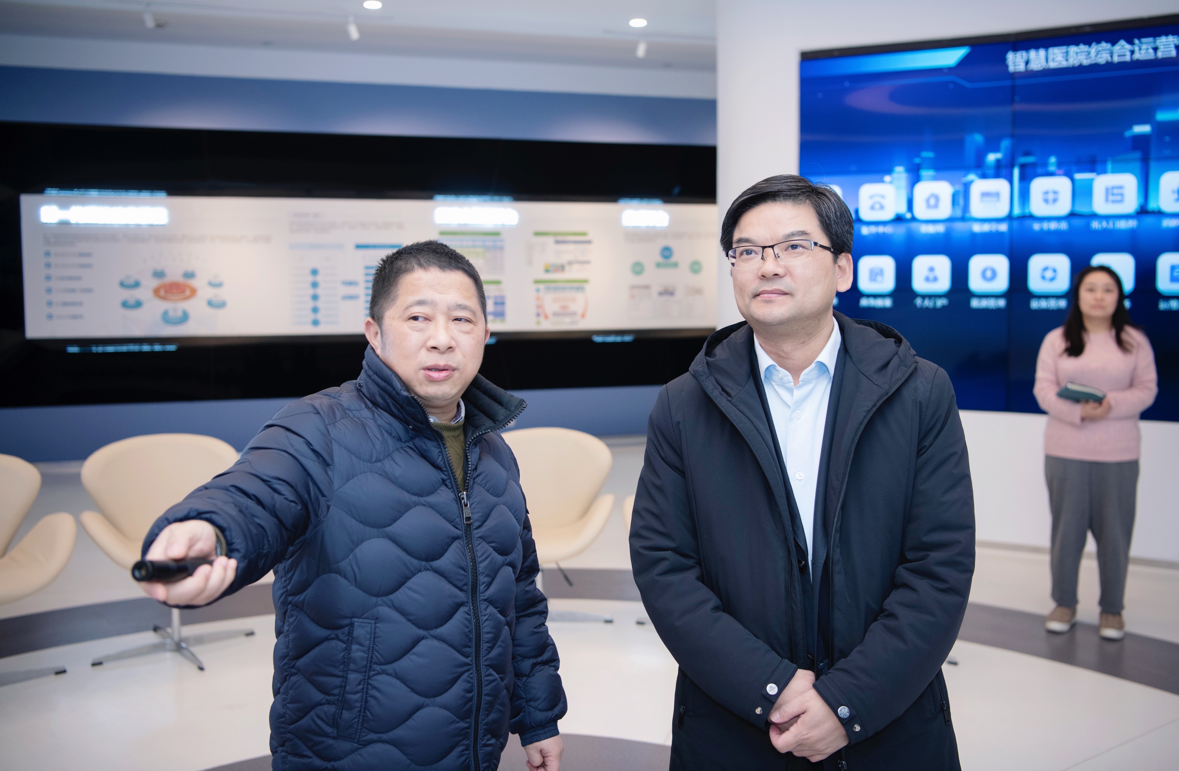 李志龍區(qū)長(zhǎng)一行參觀了和仁科技智慧醫(yī)療展廳,聽(tīng)取了企業(yè)的發(fā)展歷程、戰(zhàn)略規(guī)劃及企業(yè)在智慧醫(yī)療領(lǐng)域取得的成績(jī),了解了“城市大腦·舒心就醫(yī)”的主要功能、實(shí)際效果等。