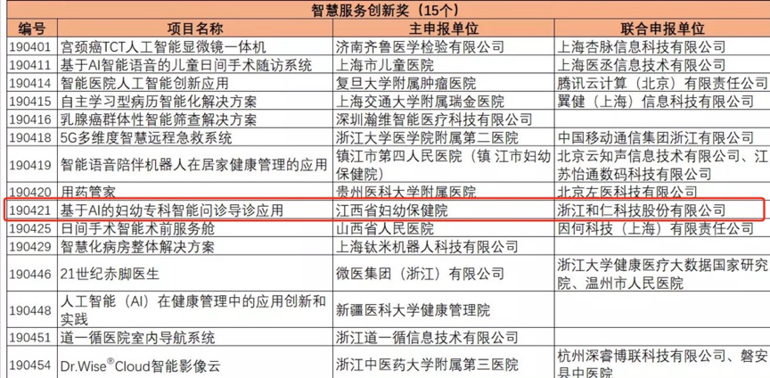 11月12日,由國家衛生健康委員會醫院管理研究所指導、《中國數字醫學》雜志社主辦的“2019全國醫療人工智能創新獎”的評選活動中,由浙江和仁科技股份有限公司(以下簡稱“和仁科技”)和江西省婦幼保健院聯合申報的“基于AI的婦幼專科智能問診導診應用”榮獲智慧服務創新獎。