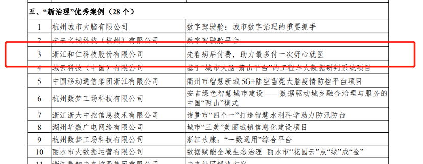 2020年11月,由浙江省經信廳組織的浙江省數字經信“五新”優秀案例評選活動,經省廳初審、專家評審等層層評比,和仁科技申報的“先看病后付費,助力最多付一次舒心就醫”方案成功入選年度“新治理”優秀案例。